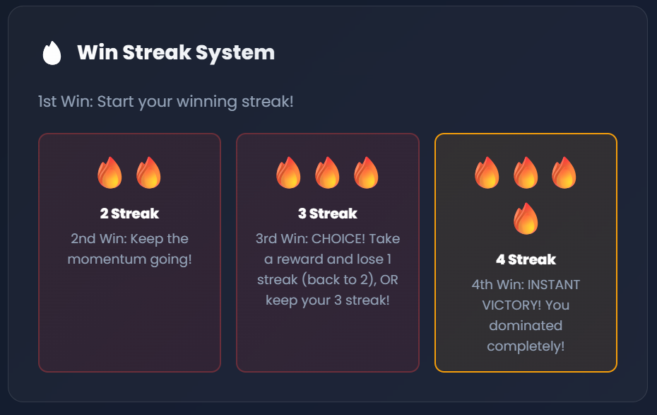 Second win — momentum builds. <span class="markdown-bold-text" <third="" win<="" span=""> — you get a choice: take a reward card</span> now (and drop back to two wins) or risk it and go for the fourth. - Fourth win in a row — instant victory. That player “dominates” and the session ends with a short victory screen.